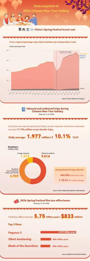 Turistický trh, zejména příjezdová turistika, zaznamenal rychlé oživení. Údaje z hlavních cestovních platforem ukazují, že rezervace letů do Číny kolem období čínského Nového roku vzrostly meziročně více než čtyřnásobně oproti loňskému Jarnímu festivalu, což podtrhuje atraktivitu Číny pro zahraniční návštěvníky.