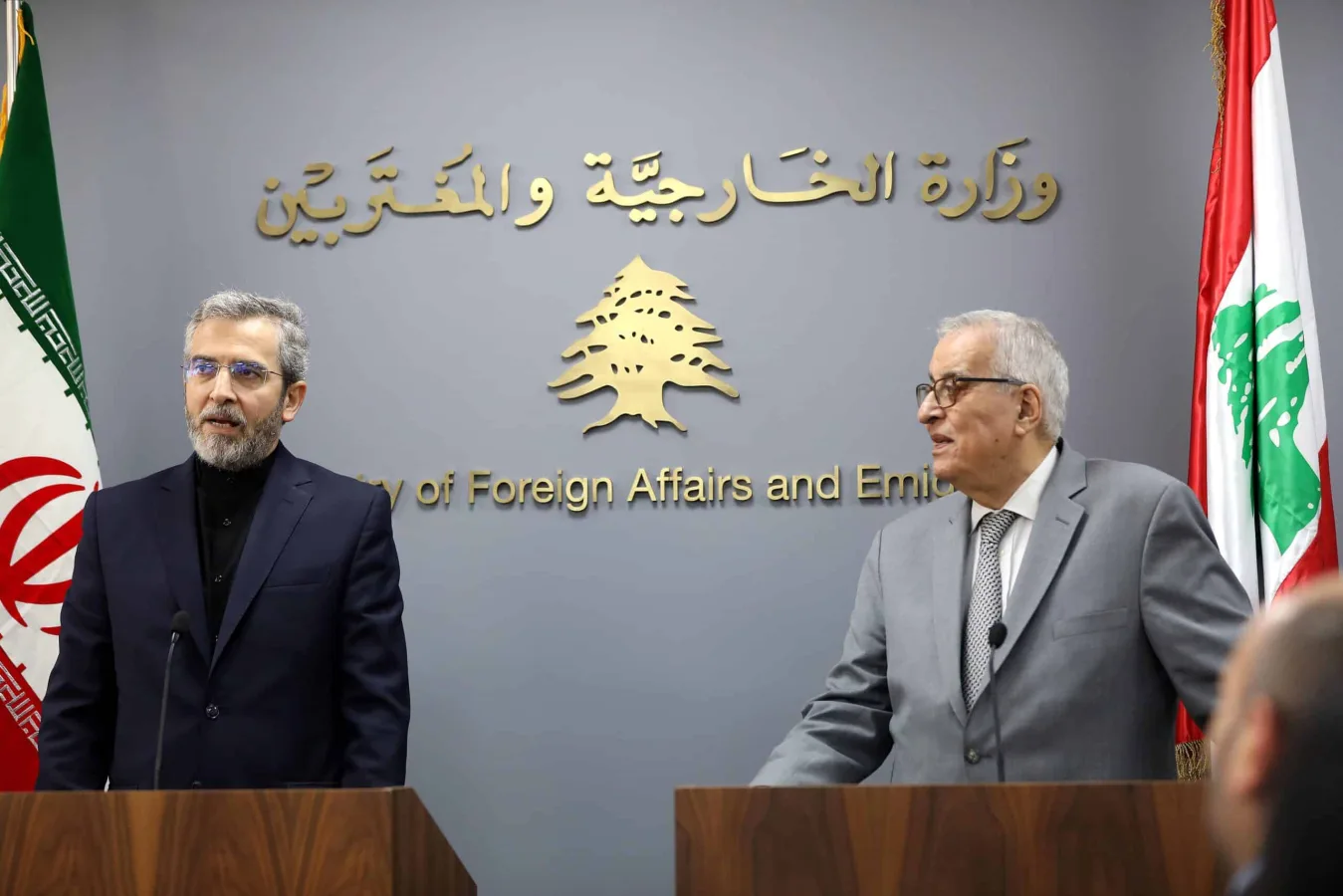 BEJRÚT, 3. června 2024 (Xinhua) – Íránský prozatímní ministr zahraničí Alí Bagherí Kání (vlevo) a libanonský ministr zahraničí Abdalláh Bou Habíb se účastní tiskové konference v libanonském Bejrútu 3. června 2024. Dočasný šéf íránské diplomacie Alí Bagherí Kání v pondělí vyzval ke svolání mimořádného zasedání ministrů Organizace islámské spolupráce, aby přijali kolektivní kroky proti izraelské ofenzivě v Pásmu Gazy.