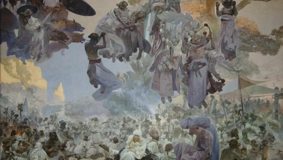 The painting depicts the autumn festivities of Svantovít. The priests thanked this god for the rich harvest and prophesied things to come. Arkona was to the Slavs what Delphi once was to the ancient world. To the right, a procession led by a high priest exits the temple. Ahead of him, he carries a bull, a symbol of the power that will be sacrificed. On a sunny afternoon, people are rejoicing, singing and dancing, only the mother with her child on her lap - in the lower centre of the painting - is sombre, perhaps anticipating how bleak the future of the tribe of the Ranas will be.