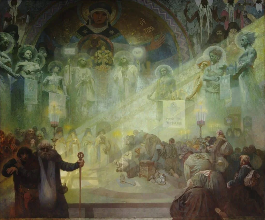 The painting depicts the interior of one of the temples of Athos, where the mosaic image of the Mother of God is located in the apse. The sun's rays from the right enter the temple, which is also lit by a number of candles. Priests stand in front of the iconostasis and offer the relics of the saints for pilgrims to kiss. In the glow of the lights float cherubs carrying models of four other Orthodox monasteries: the Serbian Chiliandar, the Russian Panteleimon, the Zoographer and the Bulgarian Vatoped. Behind the cherubim we see the images of four igumens - the superiors of the aforementioned monasteries. In the foreground stands a young man supporting a blind old man - the young man is again Mucha's self-portrait.