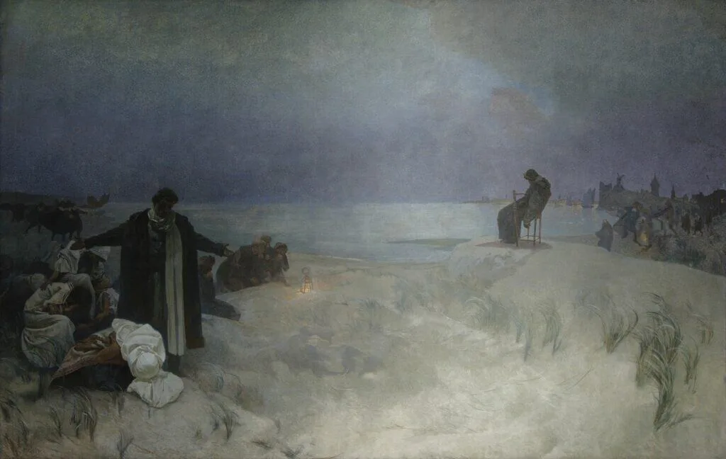In Holland, he used to go to the seashore to reminisce about his distant homeland before advanced age and illness confined him to a chair. The gesture of despair of his friend, the grief of his wife and others suggest that the painting depicts the last days of his life. The dream of returning home is extinguished like the flame of a lantern on a sandy overhang. He knows he will never see the freedom of his homeland again.