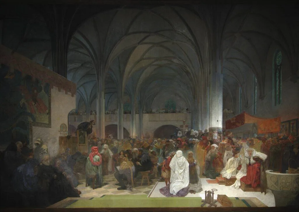 Queen Žofie, whose confessor Jan Hus was and who often defended him to her husband, King Václav IV, is watching under the canopy on the right. Her lady-in-waiting takes the form of Mucha's wife Marie, née Chytilová. This figure is looking to the right, where there is a hooded figure in the corner behind the Romanesque font. He is a spy for the Catholic priests who wanted to be informed about the content of Hus' sermons. In them, Hus railed against the iniquities of the Church and the selling of indulgences as a form of penance.