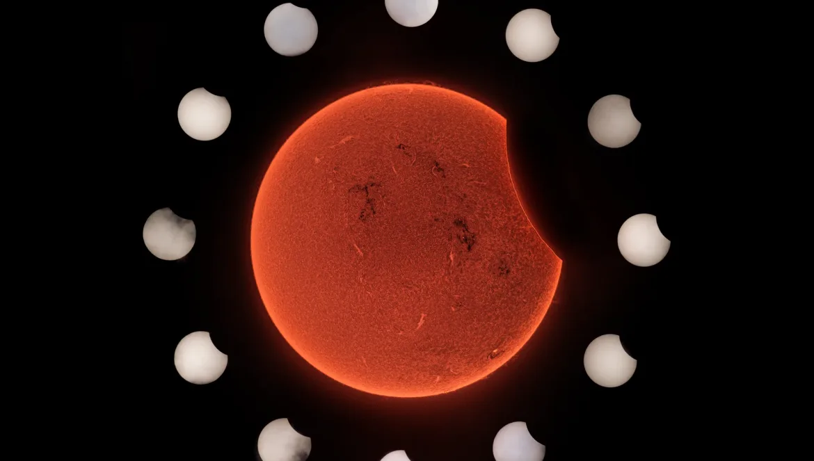 But let's go completely to the present. We have here a film by Michal Šrejber and Marek Tušl called The Sun through the Eyes and Hydrogen. The authors used the eclipse on March 29, 2025 to capture an impressive photographic composition. They have used the observation in the so-called white light, i.e. as we can see it with our eyes. Using effective eye protection, of course. These black-and-white images of the solar photosphere, with cloud cover in some places that made the observer somewhat uncomfortable, surround a central reddish view of the solar chromosphere. Although this is shown in a negative view, we can still see active regions in the dark view. In contrast, sunspots and prominences visible from above are bright. The solar chromosphere lies above the photosphere on the Sun. It is only about 3 000 to 5 000 km thick, about the radius of the Earth. It is relatively transparent, more so than the underlying photosphere, which we can also observe below it. From the right side, which is also true for images of the photosphere, the Moon "bites" into the Sun. Or perhaps a dragon?